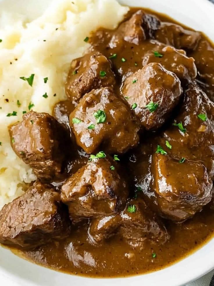 Here’s a comforting recipe for Beef Tips and Gravy Served Over Mashed Potatoes—rich, savory, and perfect for a hearty meal.