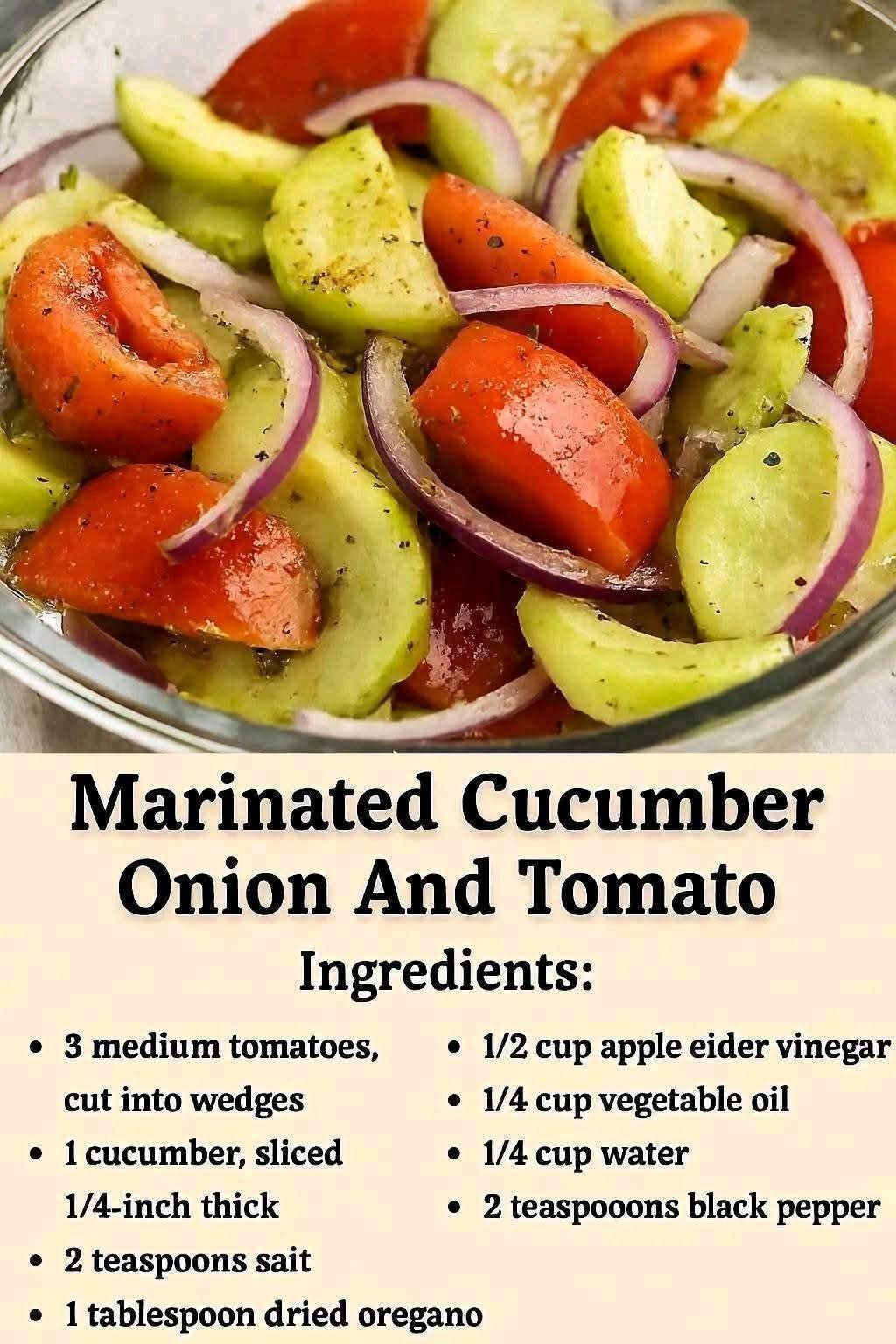 A Marinated Cucumber, Onion, and Tomato Salad is a refreshing and tangy side dish that’s perfect for summer barbecues, picnics, or just a light, healthy meal. The crisp vegetables soak up the flavorful marinade and become even more delicious as they sit. Here’s a simple and tasty recipe: